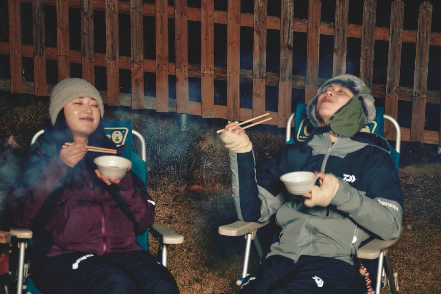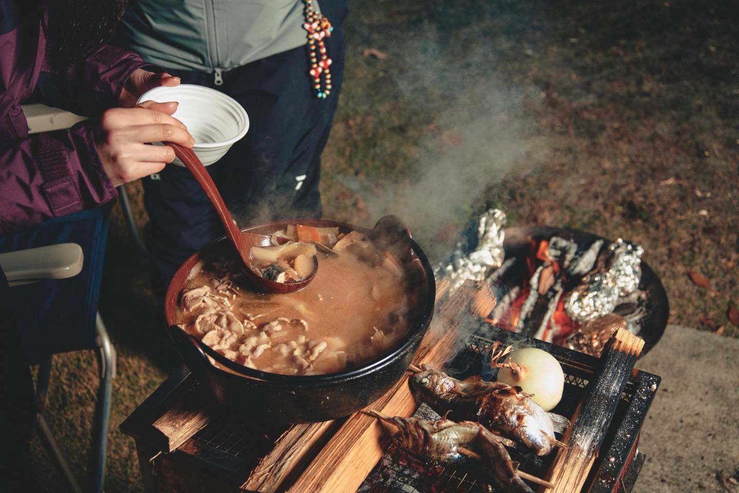 椎名美月 and 木風( Kaede )2人の釣りガールがランクル80で釣りキャンプ - GIRL HOUYHNHNM × DAIWA(ダイワ)- 温かい料理は冬キャンプの醍醐味