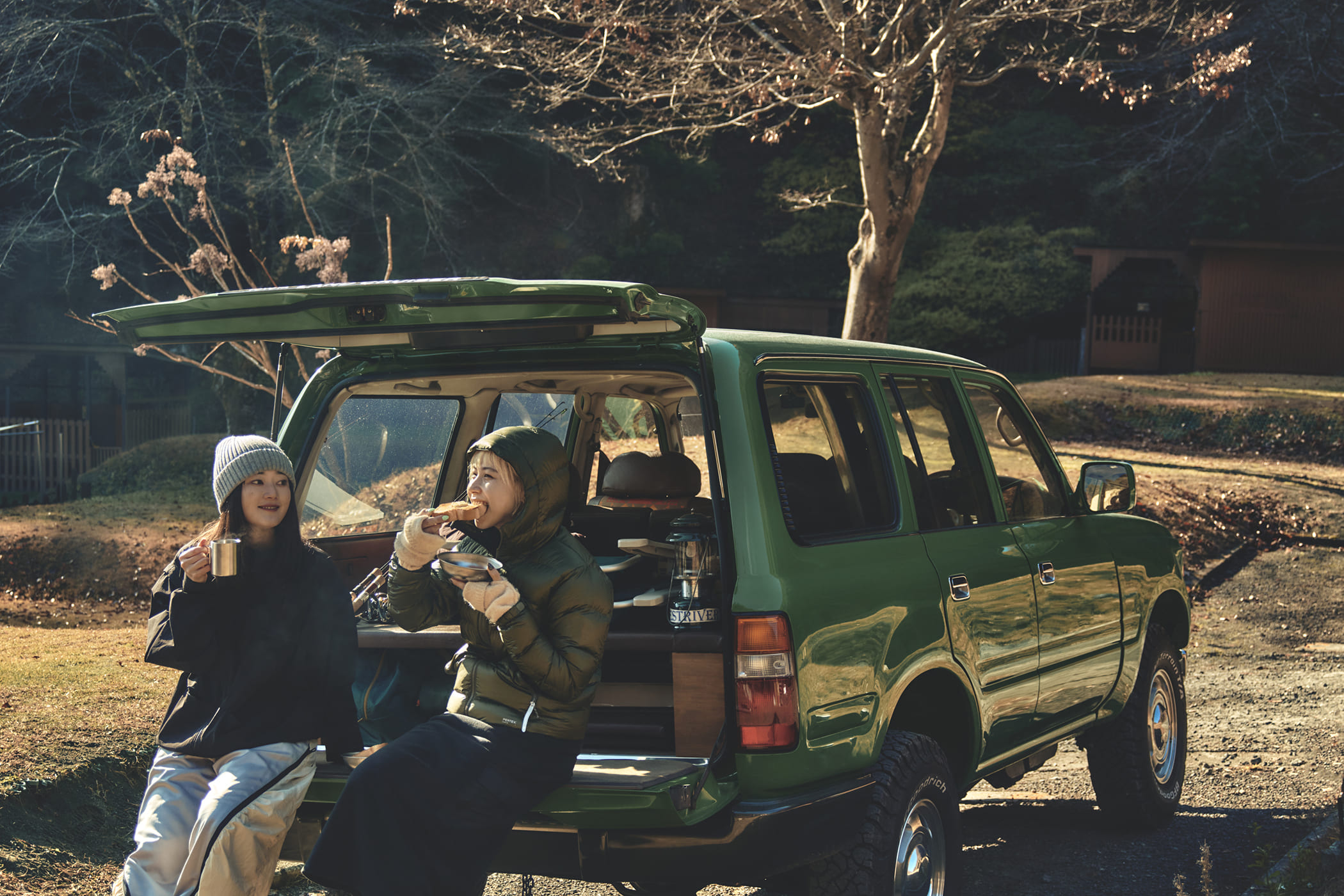 ランクル80で釣りキャンプ×クルマ旅 with 椎名美月 and 木風( Kaede ) by GIRL HOUYHNHNM × DAIWA(ダイワ) 上下開きの荷台に座ってキャンプ飯
