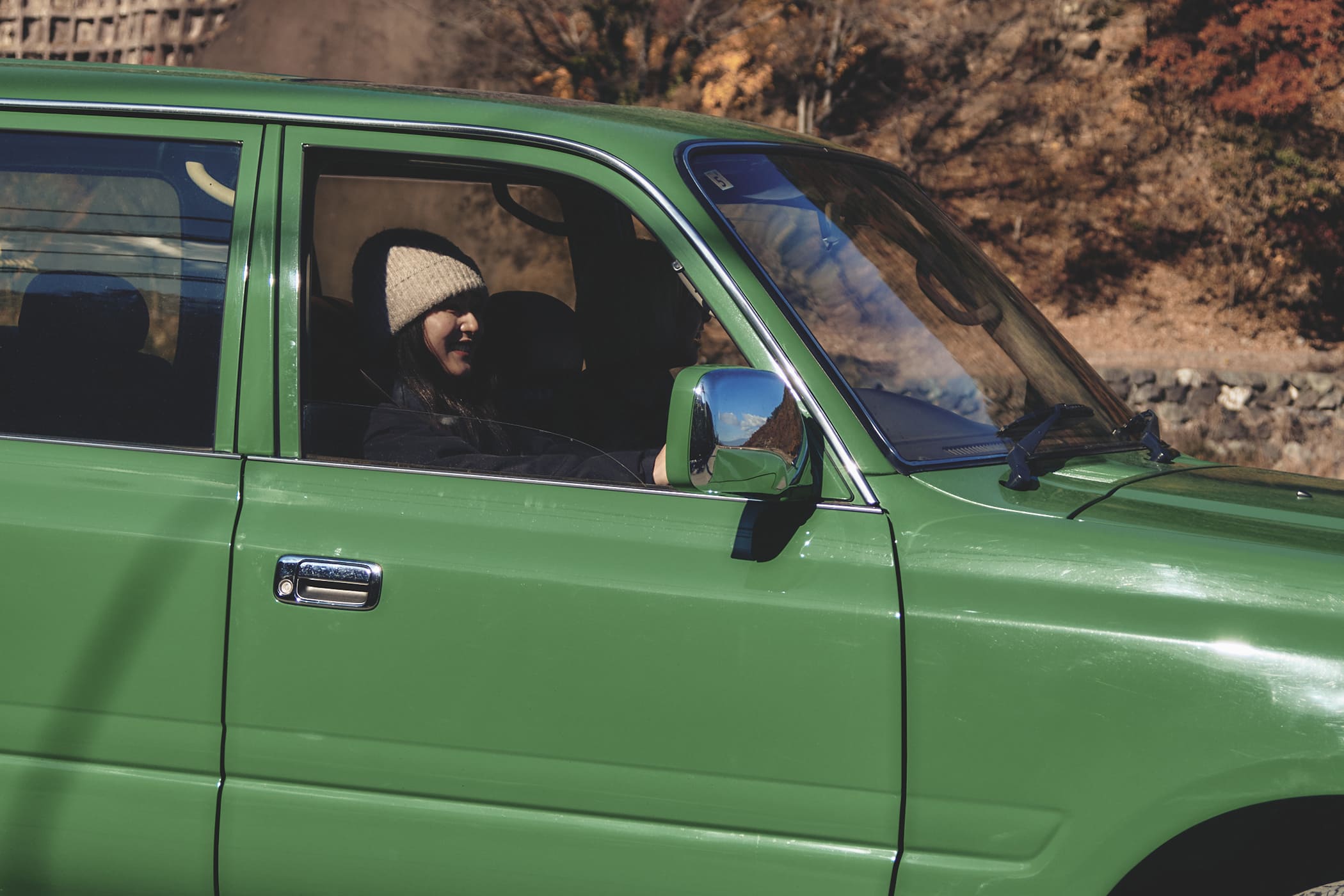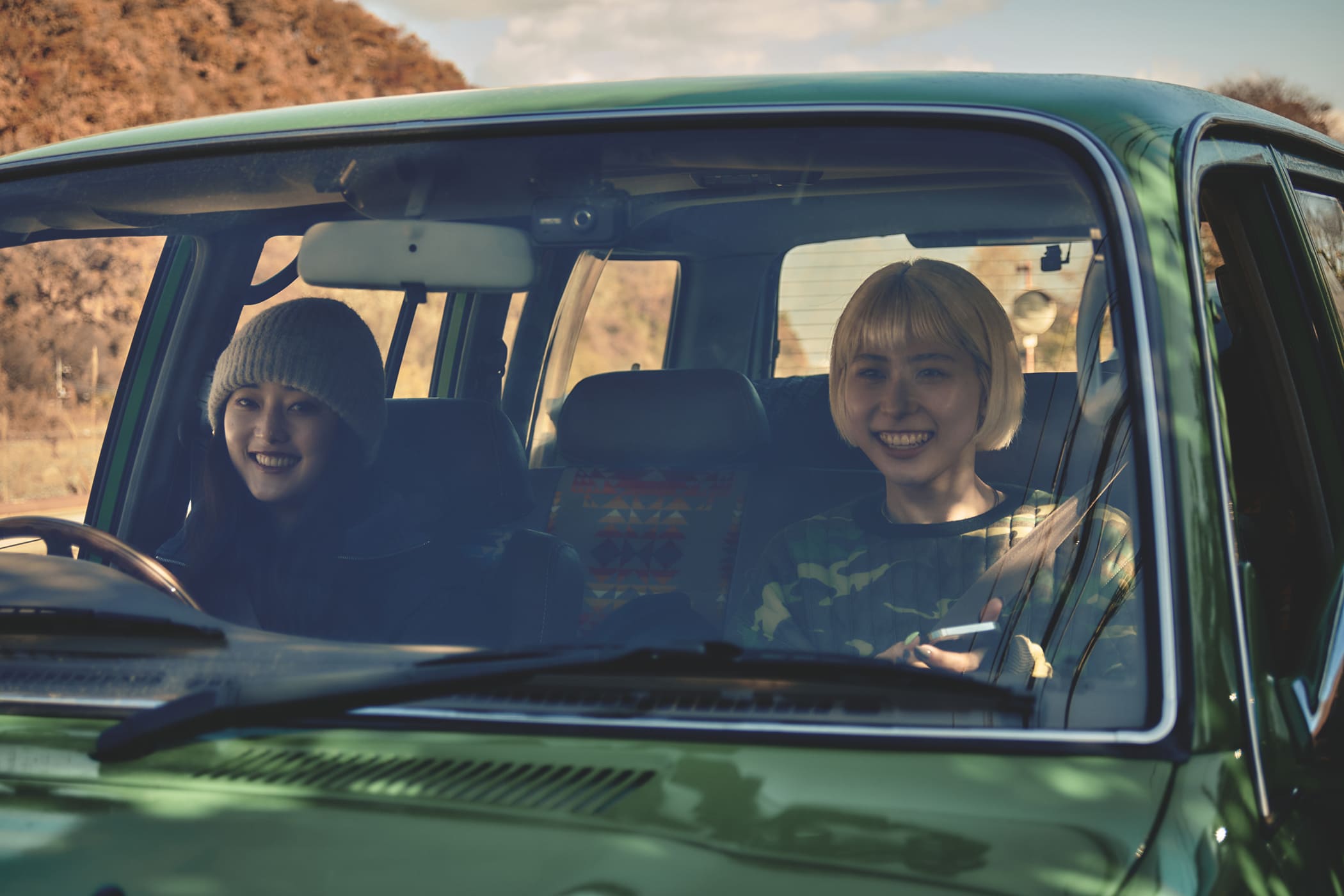 ランクル80を運転中 椎名美月 and 木風( Kaede ) 2人の釣りガール 釣りキャンプの道中 - GIRL HOUYHNHNM × DAIWA(ダイワ)-