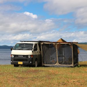 車中泊仕様のハイエース+ARBサイドオーニング+オーニングルームなら、簡単車中泊キャンプ可能です!